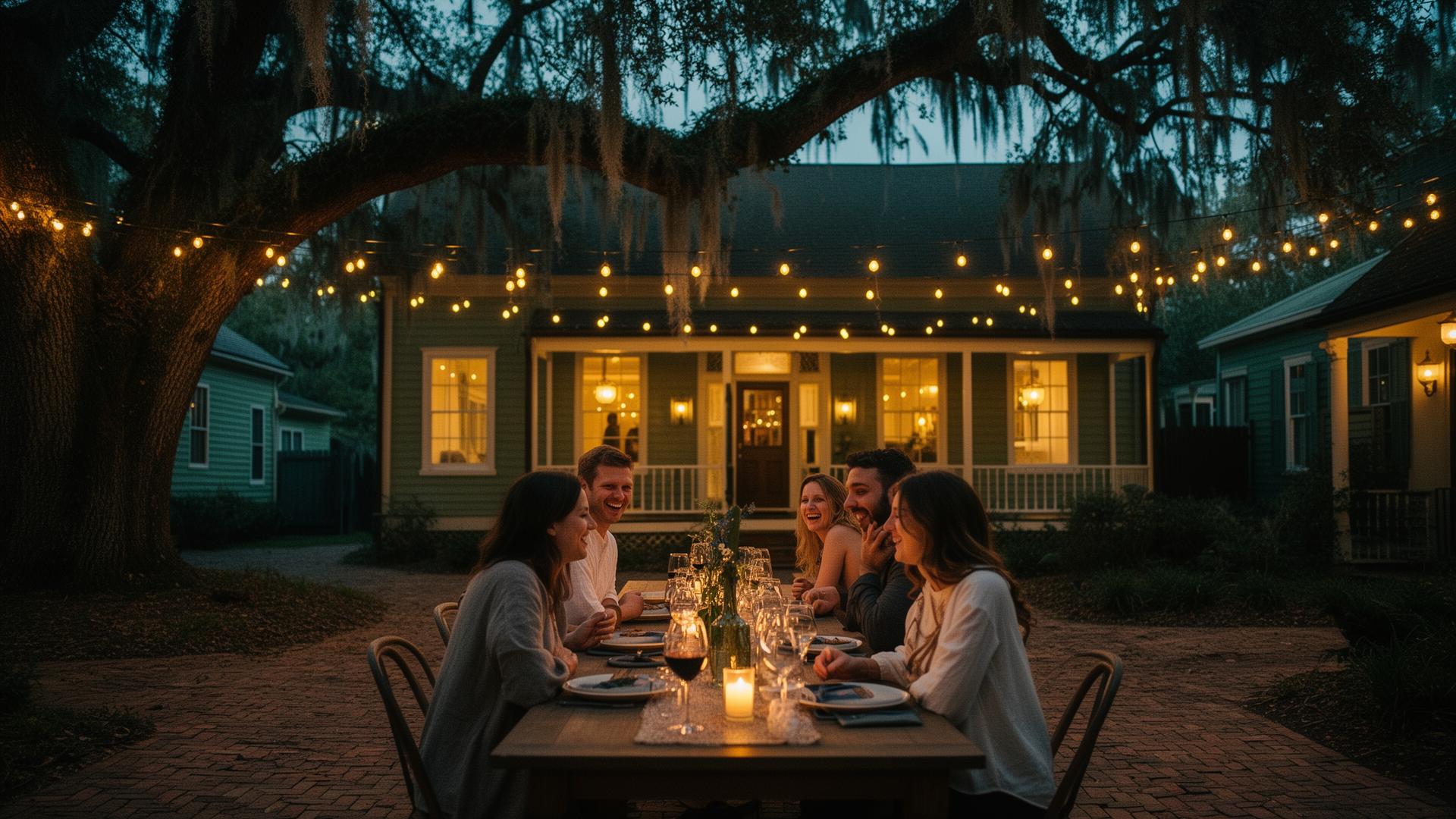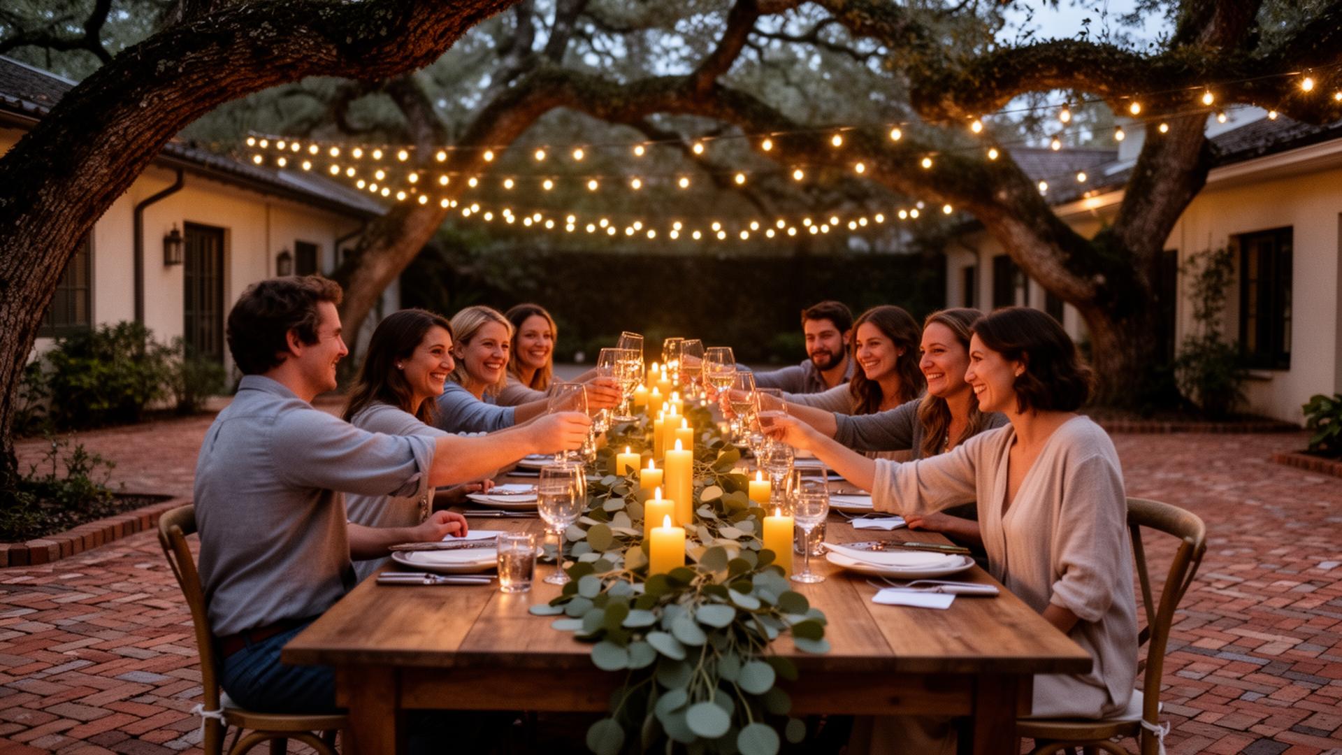 One long candlelit table down the brick pavers. Friends still talking about it weeks later.
