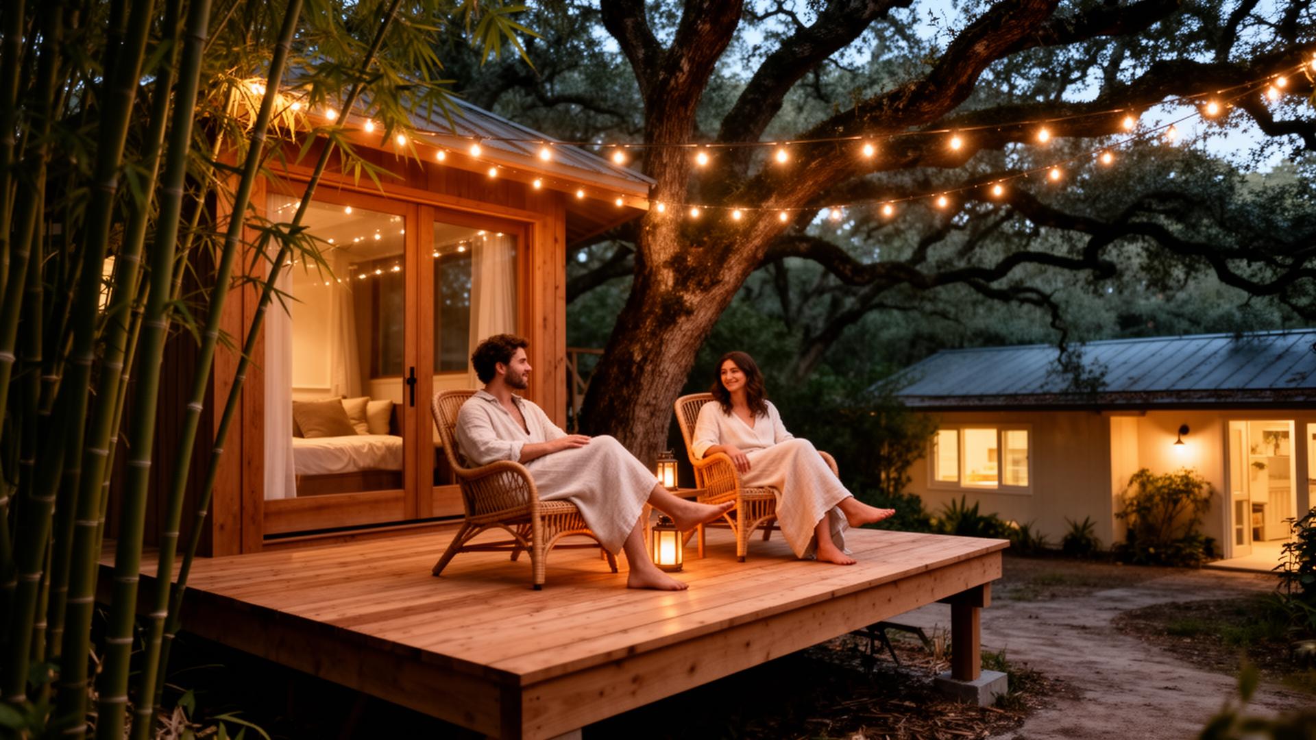 A raised cedar room held up among the bamboo and live oak. Climb the stairs to your own deck, string lights overhead, the courtyard glowing below. Sleeps two.